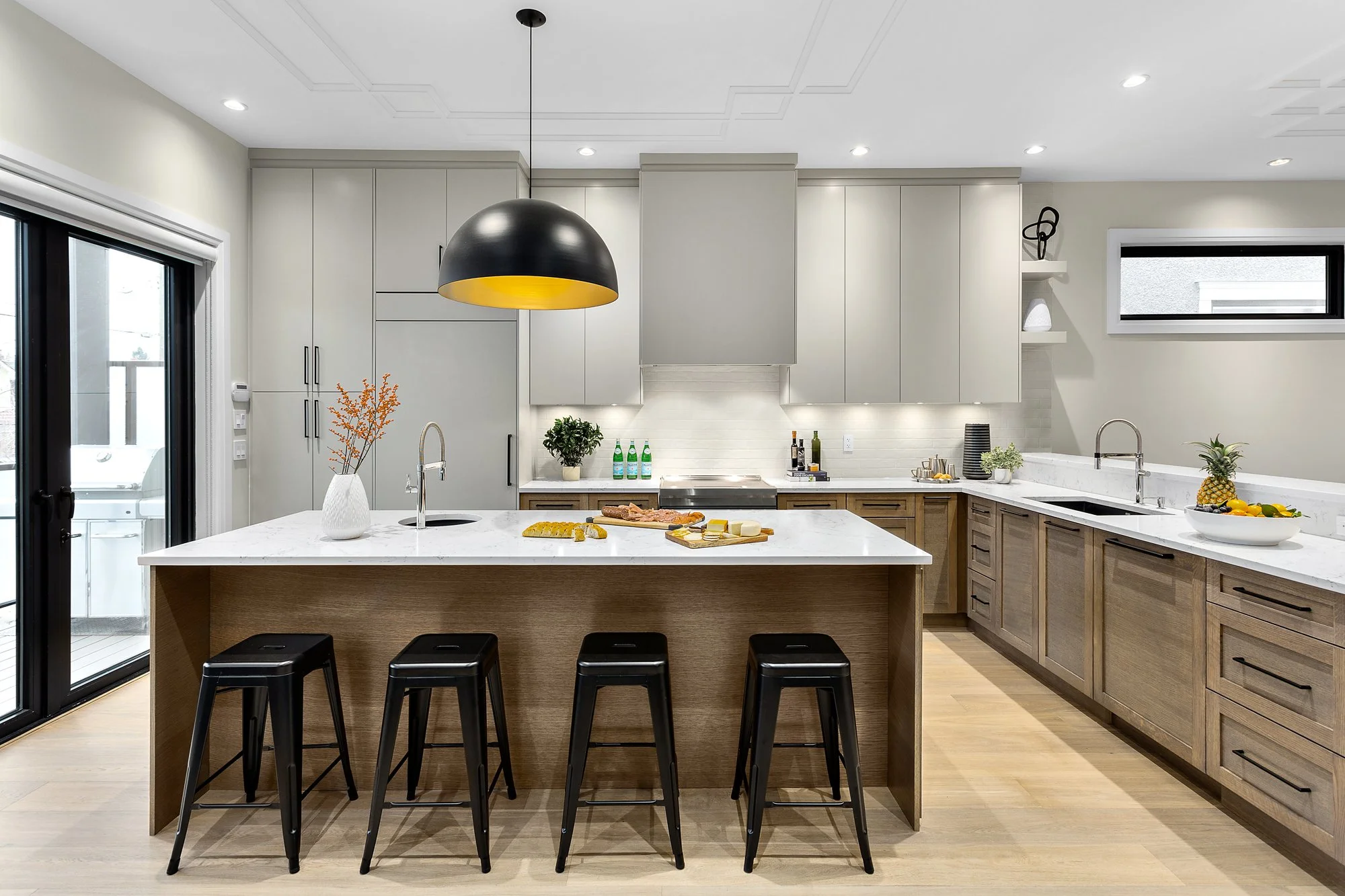 Dazzling Mix in Douglas Park is a modern new build designed in Vancouver BC. The detailing from the walkway to the timeless traditional windows make this home stand out! Zoning in this area created some significant limitations to the building envelope, Beyond Beige Interior Design created a modern-day British row home exterior façade. That being said, using white brick and dark windows gave the home a classic British charm. Moreover, for the interior, the clients wanted a contemporary feel with European influences and eclectic touches. The challenge was to blend traditional elements found in historic homes with current design styles. Beyond Beige Interior Design achieved this by keeping strong black and white contrasts and adding textures, details, and warm wood tones. In addition, the team accentuated the mix of modern and traditional designs on the ceiling by adding historic panel molding and modern light fixtures. This gave the home charm and character. Resulting in a timeless look that captured anyone's attention who walked through the doors.